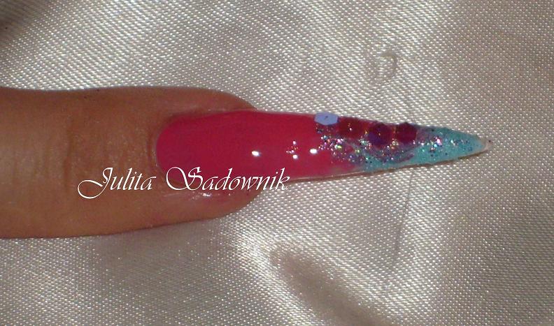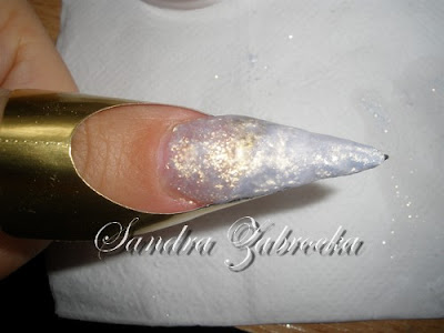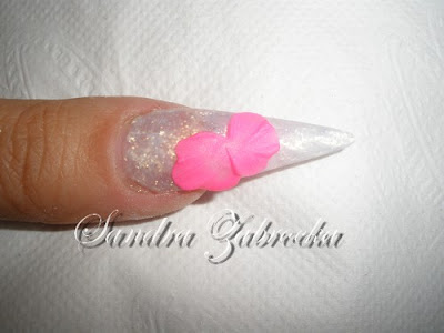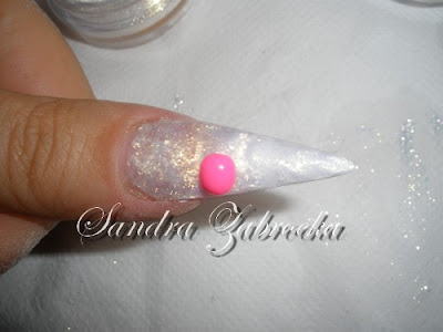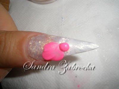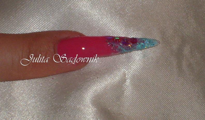 Nakładamy akryl transparentny z brokatem w kolorze różowym (Las Vegas - Cyrax)i muszlę kruszoną.