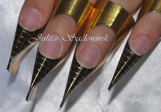 1. Standardowo przygotowujemy płytkę paznokcia, podkładamy szablony i za pomocą przeźroczystego żelu lub akrylu przedłużamy paznokcie w szpic. Akrylem kamuflującym ze złotymi drobinkami przedłużamy łoże paznokcia w szewron.