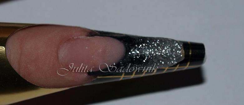 4. Cieniuję fioletowy akryl na mlecznym szkielecie, przejście pomiędzy płytką, a szkieletem maskuję lekko różowym brokatem.