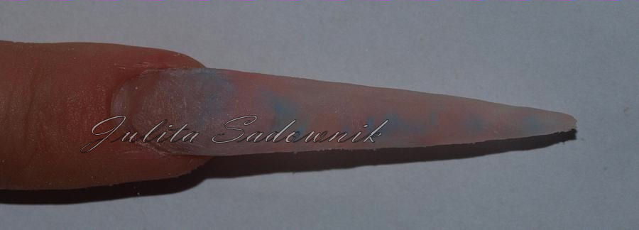 2. wolny brzeg i część paznokciowego koryta cieniujemy białym perłowym akrylem.
