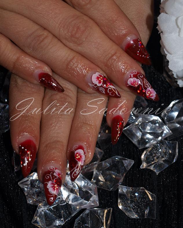 Boszz Julcia, ale pocisnęłaś, no te kolorki takie soczyste malinki, letnie i jeszcze Twoje malowanki, tylko podziwiać. A jak już większość dziewczyn pisała, to szpice wbrew pozorom są wygodniejsze niż kwadraty, bo zwężają się do dołu i łatwiej nimi operować:D Tylko ja w polu pracuję też, to by mi szkoda było, ale raz miałam :ok: