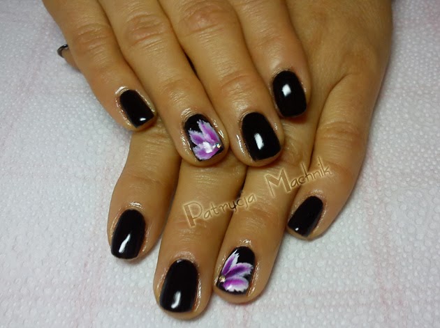 Mani,Nail desing nie wiem jaki nr,ale na żywo jest to fiolet z jakby drobinkami niebiesko-granatowymi.